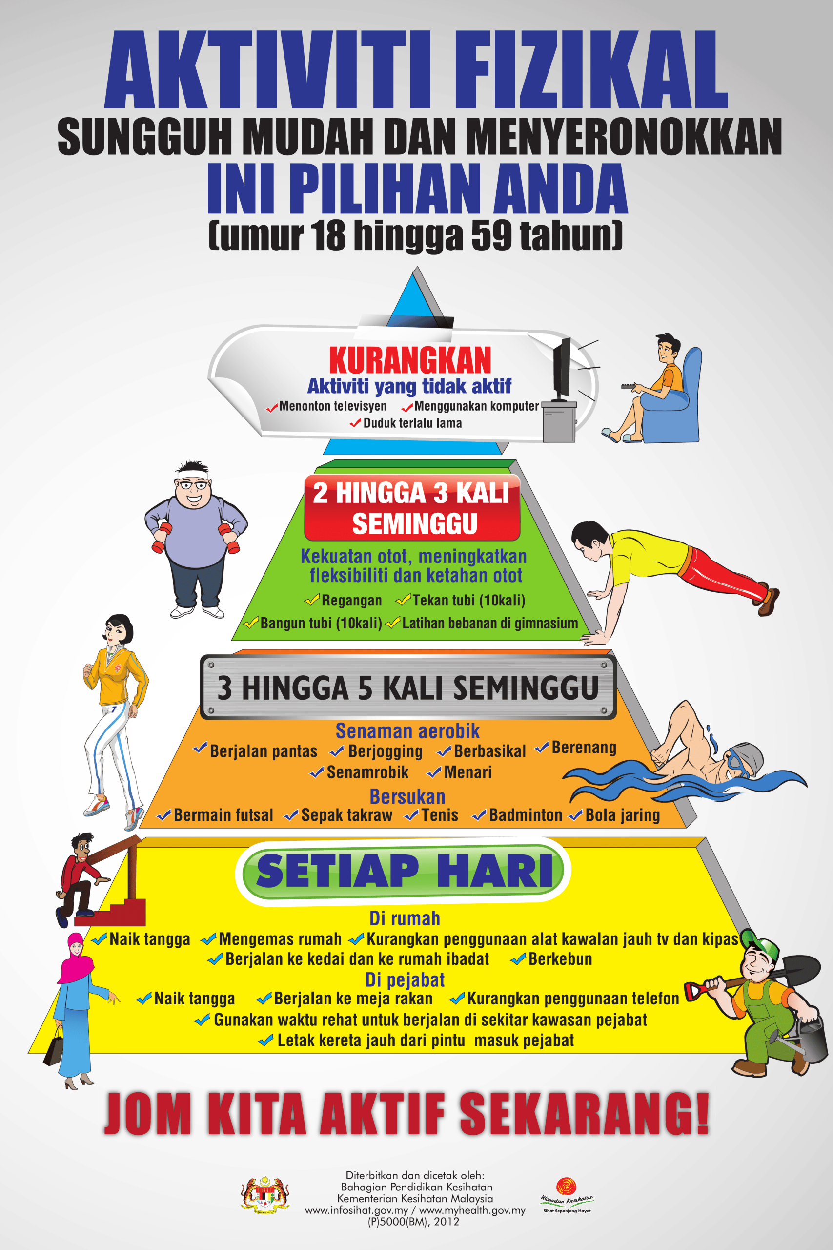 Pilih aktiviti fizikal yang sesuai dengan anda. Lakukan aktiviti fizikal ringan hingga sederhana sekurang-kurangnya 30 minit sehari.