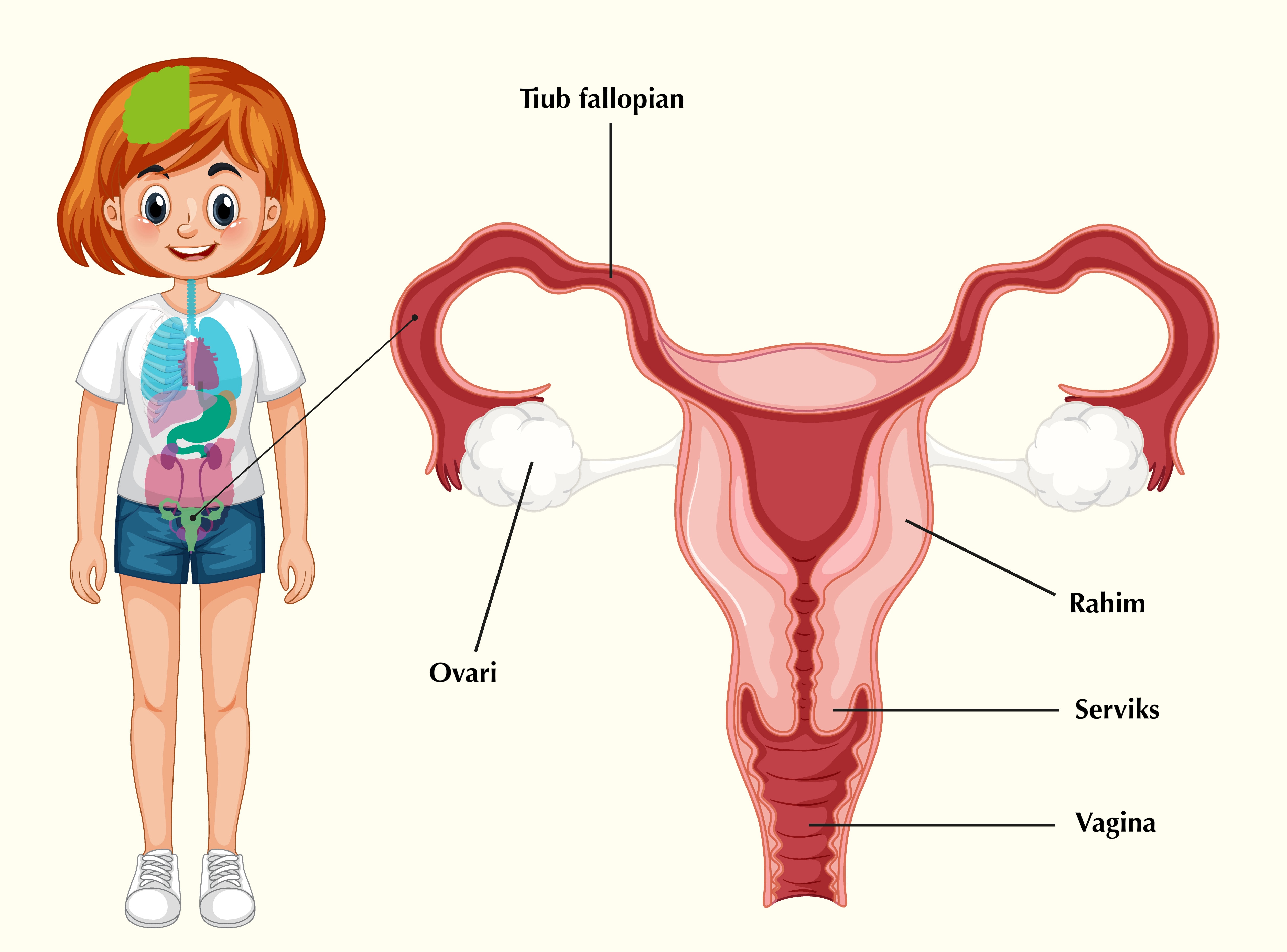 - Ketika pertengahan kitaran haid, ova dibebaskan dari ovari. Ova akan bergerak menuju ke rahim melalui saluran tiub fallopian. Sekiranya ova tidak disenyawakan oleh sperrna, ova akan hancur dan dikeluarkan dari tubuh. Lapisan tebal darah di dalam rahim akan dikeluarkan sebagai haid.