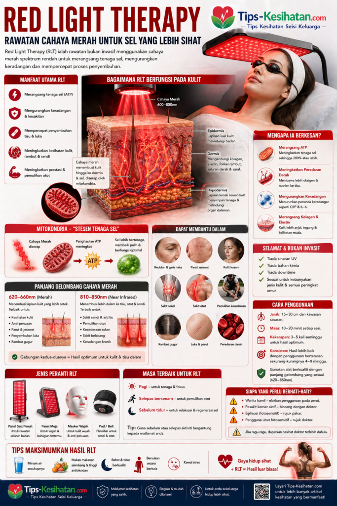 Red light therapy (RLT) adalah rawatan menggunakan cahaya merah atau near-infrared untuk merangsang aktiviti sel dalam badan.