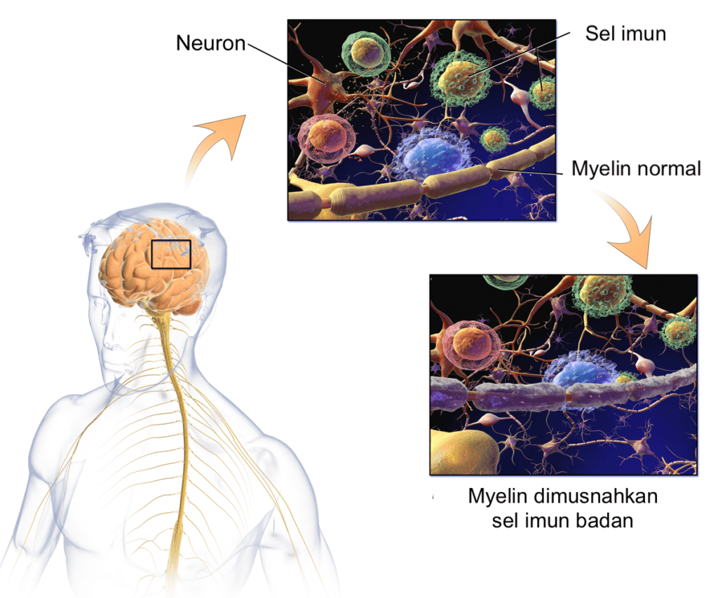 Pada pesakit MS, kerosakan myelin (demyelinasi) menyebabkan gangguan kemampuan serabut saraf untuk menghantarkan isyarat kepada dan dari otak, yang pada akhirnya menghasilkan berbagai macam gejala MS. Lokasi terjadinya kerosakan myelin (plak atau lesi) seolah-olah sebagai kawasan (parut / luka) yang mengeras.