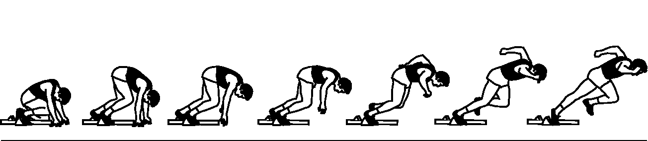 - Pelari bergerak ke hadapan dengan meletak hujung kaki hadapan rapat kepada garisan mula tanpa menyentuhnya, kaki belakang sedikit ke belakang, kira-kira 30-40 cm dan mengimbangkan badan.