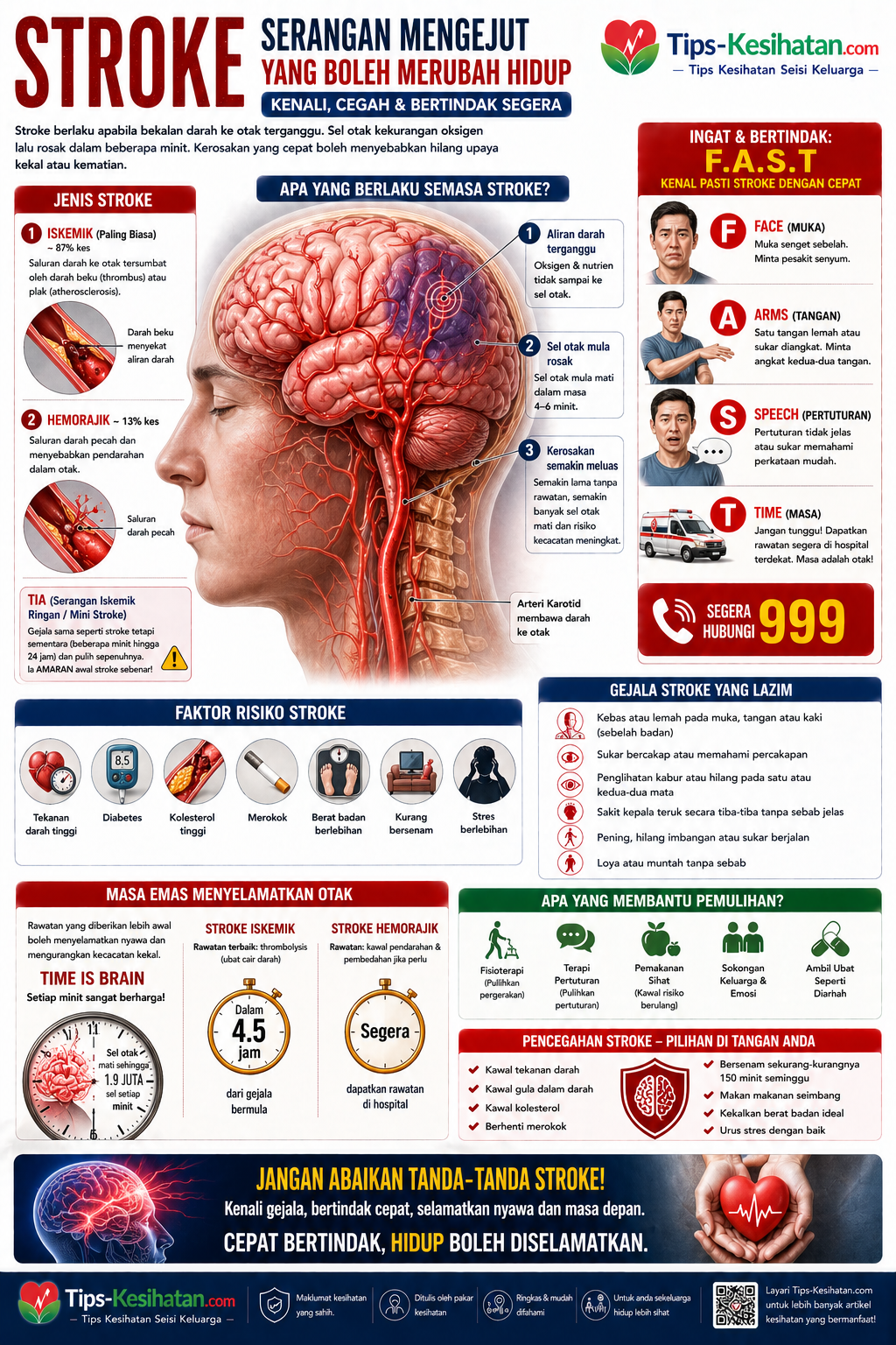Stroke berlaku apabila bekalan darah ke otak terganggu, menyebabkan sel-sel otak mula mati dalam masa yang sangat singkat.